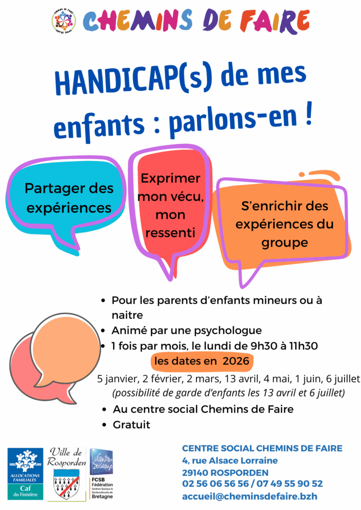 Le groupe de parole pour les parents d’enfants en situation de handicap se poursuit en 2026. Vous trouverez les dates dans l’image ci dessous. La prise en charge de vos enfants peut être assurée pendant ce temps de parole, au centre social, prévenez-nous !